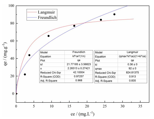 彩运cy888 当反应温度为25℃,投加量为8g/L时,可获得不同初始浓度下亚硝基二乙胺的平衡浓度和改性活性炭的平衡吸附容量。使用Langmuir和Freundlich热力学方程对数据进行拟合,结果如所示图3从图中可以看出,吸附过程不符合Langmuir等温线方程,Freundlich吸附等温线方程也适用。当初始浓度达到一定值时,吸附趋于平衡并达到饱和。