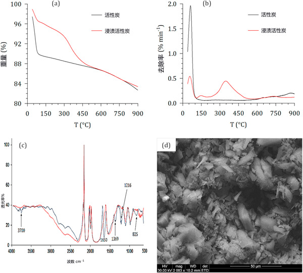 图1:活性炭和浸渍活性炭的理化特性:(a)热重分析失重曲线,(b)热重失重率曲线,(c)FTIR光谱,(d)SEM显微照片(仅限浸渍活性炭)。