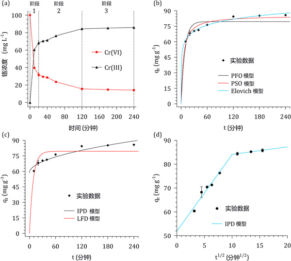 彩运cy888 图2:(a)六价铬溶液和浸渍活性炭接触时间对Cr浓度和形态的影响。(b)反应动力学模型、(c)扩散模型和(d)线性化的颗粒内扩散模型。