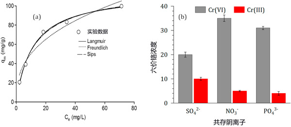 彩运cy888 图3:(a)浸渍活性炭吸附六价铬的平衡等温线,(b)竞争阴离子对平衡铬浓度的影响。