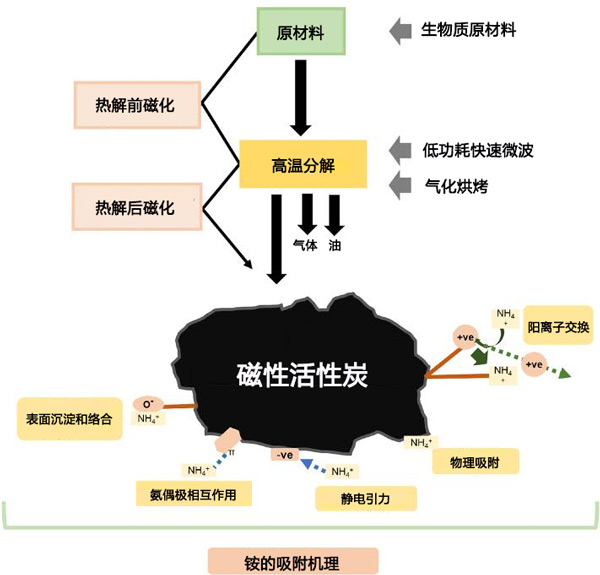 彩运cy888 图1:活性炭生产概述,包括可能的原料和热解方法的非详尽示例,以及可能发生的铵吸附机制的范围。