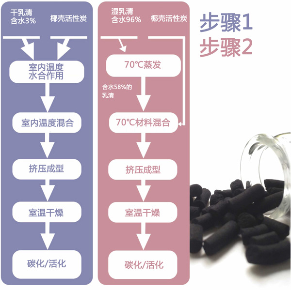 彩运cy888 图1:使用乳清作为粘合剂制备碳化和活性炭颗粒的路线示意图。