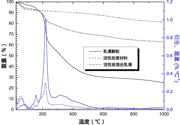 由于这种粘合剂对于这一特定应用的新颖性,有必要首先研究原料颗粒的碳化。图2显示了在非氧化气氛下活性炭前体和仅有粘合剂的生粒料在非氧化气氛下的热行为。椰壳炭在所研究的温度范围内非常稳定,在1000℃时仅减轻17.7%的重量,其中几乎一半(8%)对应于水分的释放。活性炭前体的这种低挥发性排放形成对比。在相同温度下观察到乳清重量损失70%。这意味着焦炭产量约为。30%的乳清粘合剂在1000℃。乳清颗粒的大部分挥发性排放发生在低于600℃的温度下,在175至275℃之间观察到大量重量损失。在类似条件下获得的纯α-乳糖或乳清蛋白的热曲线中不存在这种热事件。据推测,这种特殊的热行为可能是美拉德聚合物或树脂的特征。这种新粘合剂的其他次要事件归因于结晶α-乳糖的脱水等。