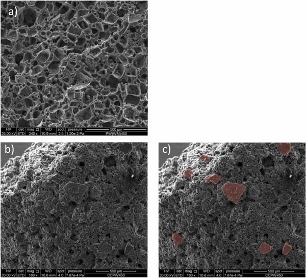 彩运cy888 图3:(a)乳清颗粒在450℃下碳化的SEM显微照片,(b)柱状活性炭在450℃下碳化,(c)与(b)相同,但原材料颗粒清晰可见。