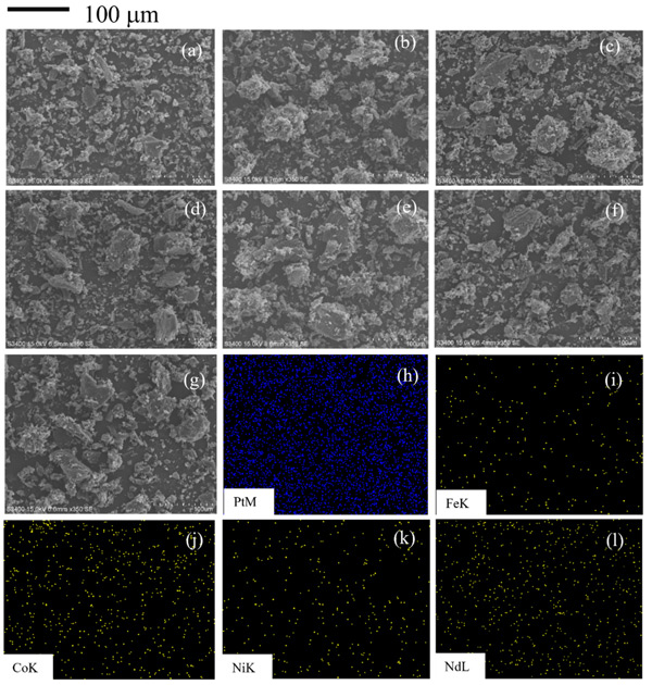 图1:(a)载铂活性炭,(b)载铁铂活性炭,(c)载磁铁,(d)载磁铁铂,(e)载钴铂,(f)载镍铂的SEM照片和(g)载钕铂活性炭催化剂以及(h)铂、(i)铁、(j)钴、(k)镍和(l)钕在活性炭上的相应元素映射图像。