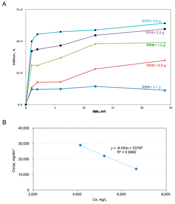 彩运cy888 图1:使用过的活性炭的吸附特性。(A)去除的COD百分比与用于吸附染色废水COD的活性炭量的关系图。(B)Ce/qe比率与Ce的关系图。