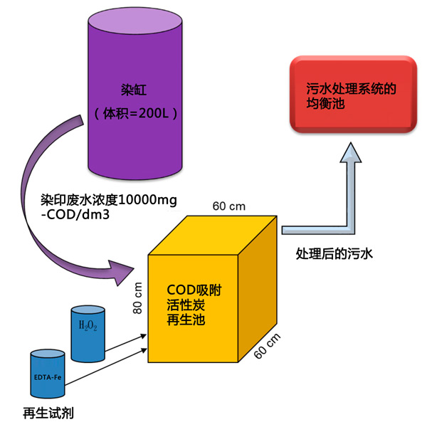 活性炭吸附处理高COD染色废水,研究中使用5g活性炭从60mL分散的富含染料的废水中吸附50-60%的COD。所用活性炭的吸附容量约为0.165g-COD/g-活性炭。在使用活性炭进行COD吸附操作期间,无需调整pH或温度。总体而言,使用活性炭吸附浓缩印染废水的COD,其次是乙二胺四乙酸铁钠催化,饱和活性炭的过氧化物氧化处理可能是去除高COD染色废水的有前景的替代方案,其氧化剂更少,COD处理效率更高。并且提出了一个按比例放大的200L吸附-再生装置,并解决了其操作过程和潜在限制。