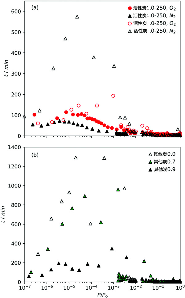 图1:(a)O2和N2等温线在活性炭上的相对压力增加和(b)N2等温线其他炭的点之间的时间。