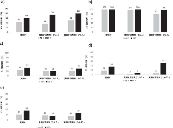图1:元素的总提取量:a)Cu,b)Zn,c)As,d)Sb,d)Co。