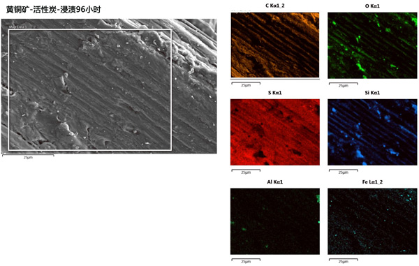 图2:浸出96小时后活性炭/黄铜矿残渣的SEM-EDS图像。