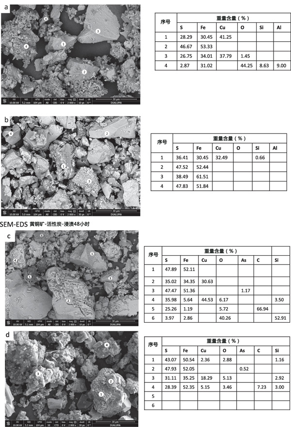 图3:(a)黄铜矿和浸出残留物的EM-EDS图像,(b)活性炭在48小时,(c)活性炭/黄铜矿在48小时,(d)活性炭/黄铜矿在96小时。
