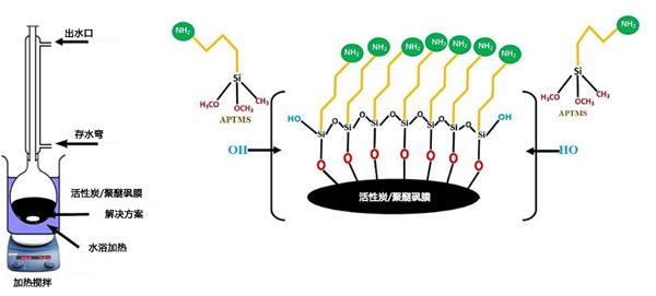 为了改性活性炭的表面,将15g非常细的干燥活性炭粉末与300mL甲苯和2mL氨丙基三甲氧基硅烷(APTMS)溶液在磁力搅拌下在40℃惰性环境下混合24小时。图1表示实验装置的示意图。使用实验室旋转蒸发仪去除溶剂。用甲苯和丙酮进一步洗涤所得的APTMS活性炭,然后在60℃下真空干燥6小时。这种干燥的活性炭被称为改性活性炭,由表面上的胺官能团组成。改性活性炭在干燥条件下储存以用于后续的实验工作。