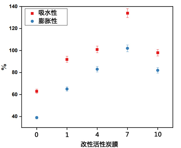 彩运cy888 图3:原始聚醚砜膜和改性活性炭结合的聚醚砜膜的WU和溶胀百分比。