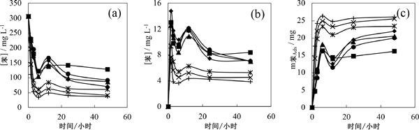 彩运cy888 图2:苯浓度随水溶液(a)气相苯浓度 (挥发) (b) 和吸附在活性炭中的苯质量 (c) 在不同活性炭的水溶液中的吸附测试期间衰减。