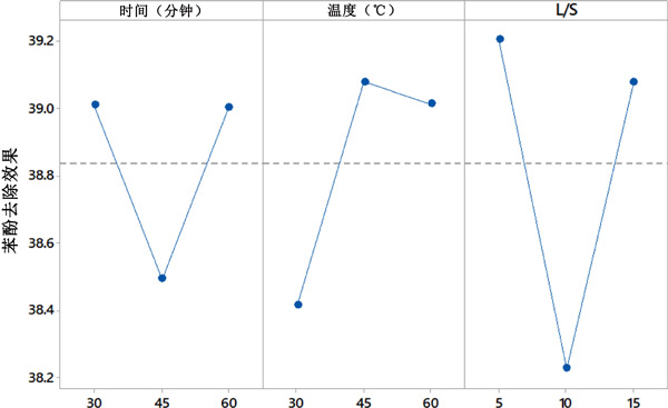 彩运cy888 田口法用于优化参数,即时间、温度和L/S,这些参数直接取决于苯酚的去除。选择田口方法的选项越大越好。本研究的主要目的是活性炭从废水中去除较多的苯酚,因此选择了越大越好的选项。此外,采用添加剂模型来确定各个输入参数对去除苯酚浓度的影响。这种分析称为因子效应的确定,结果见图2。