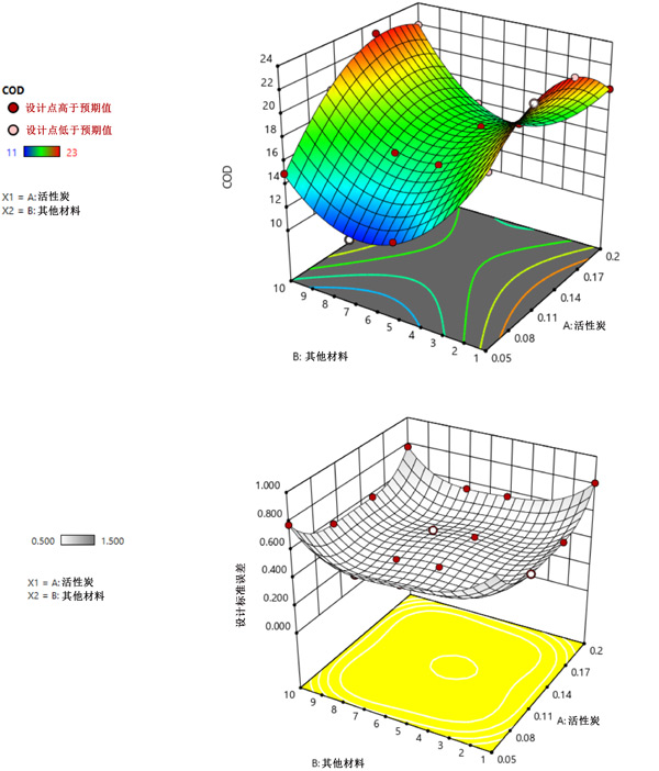 图1:用于活性炭工艺的有效实验变化与COD去除的3D图和标准误差。
