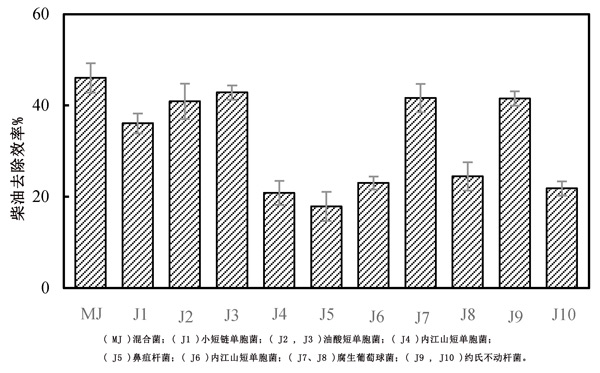 从混合菌中共分离出10株具有高柴油降解能力的菌株如图1所示。根据16SrDNA扩增和测序步骤的结果,10个优势降解菌株包括6种短链单胞菌、2种葡萄球菌和不动杆菌。建议筛选出的细菌具有以柴油为碳源在溶液中生长和增殖的功能。与未添加降解菌的样品相比,在水中添加单一菌种或混合菌种对柴油的降解效果显着,去除效率提高了17.89-46.05%。混合菌株对柴油的去除效率最高(46.05%)。此外,考虑到混合菌株也具有最快的生长速度和最大的种群,有助于增强细菌的适应性,提高柴油的降解效率。因此,在以下实验中选择混合菌株固定在活性炭上。