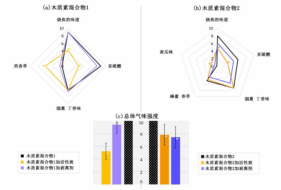 图1:(a)木质素混合物1和(b)混合物2的气味特征,(c)用活性炭或汽提剂处理的两种木质素混合物的整体气味的等级。