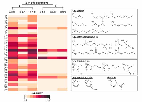 彩运cy888 图2:(a)在未处理和处理过的两种木质素混合物中检测到的含硫气味剂气味稀释因子的彩色差异和(b1-b5)硫气味剂的结构式根据其化学结构分为亚组数字(2-44)是指气味的连续顺序。