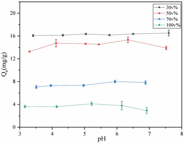 图1:溶液pH对邻苯二甲酸二丁酯吸附能力的影响。本文图例中的每个体积分数为乙醇含量。