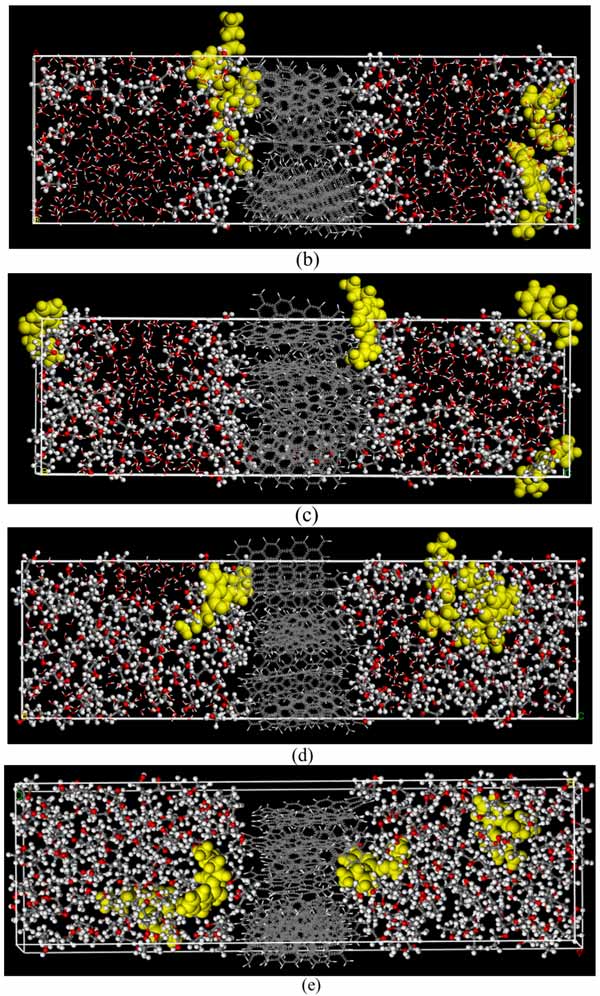 图3:不同乙醇含量溶液的模型快照:(a)0v%、(b)30v%、(c)50v%、(d)70v%、(e)100v%。