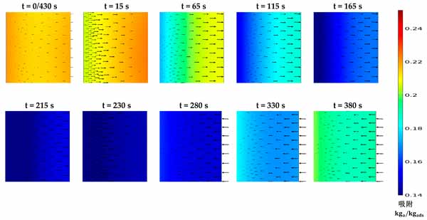 活性炭复合吸附剂的压力和温度决定了平衡吸收,它代表了在给定时间分别在吸附和解吸阶段可以达到的最大和最小吸收容量。然而,颗粒内和颗粒间的传质阻力表明吸附材料在每种给定情况下可以多快达到其平衡吸收能力。这突出了在本研究中同时求解两种传质机制与其他控制方程的重要性,以显示促进传热对传质的净效应。图2显示了在430秒循环时间内,考虑到预热和预冷阶段均为30秒的时间间隔内代表性部分的固结吸附剂域的温度分布。