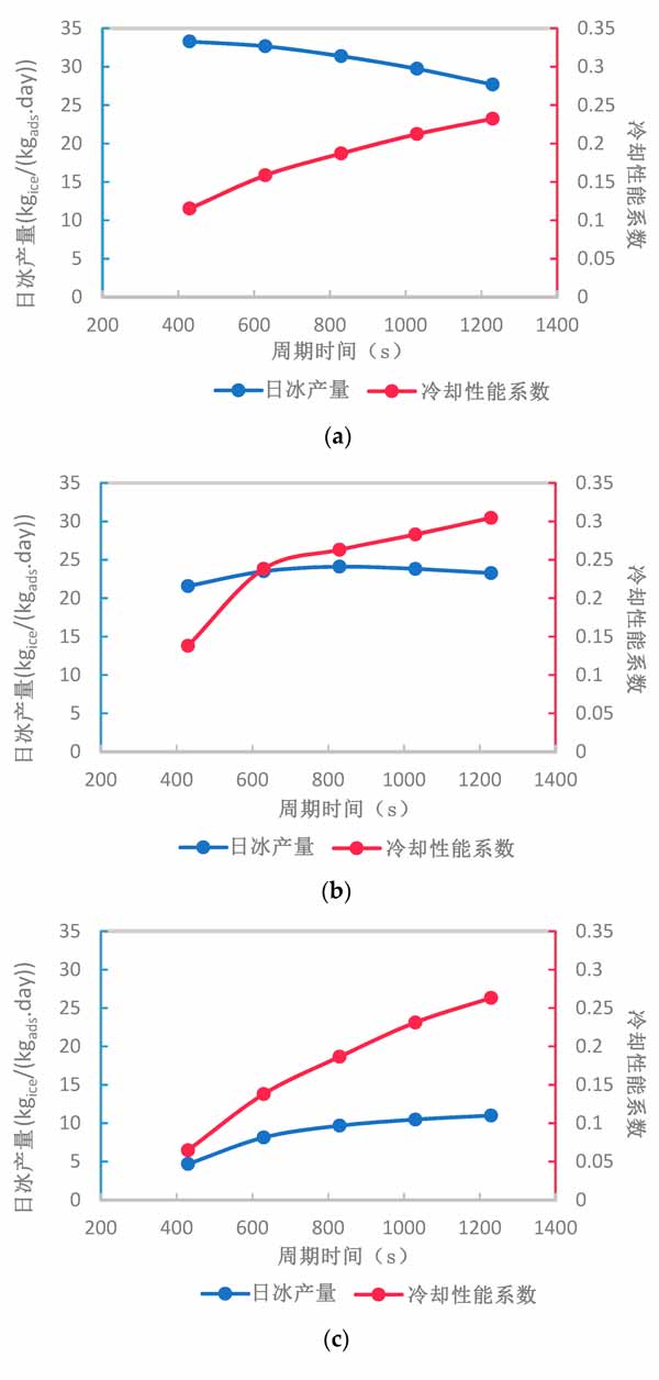 在活性炭厚度为2、5和10mm时,循环时间的变化对制冰系统的每日制冰量和冷却性能系数的净影响如图4所示。总体而言,在给定范围内增加循环时间可以增加或减少系统的每日制冰量,具体取决于活性炭复合材料的厚度。然而,无论活性炭复合材料的厚度如何,系统的冷却性能系数通过增加循环时间而增加。尽管如此,系统冷却性能系数在1230的较长循环时间和5mm活性炭复合材料厚度下达到其最大值。通过增加活性炭复合材料的厚度,日冰产量在不同循环时间内的变化范围显着减小,这可以通过比较图4a-c中给出的每日制冰量范围看出。这归因于活性炭复合材料厚度较厚时有效吸收的减少。
