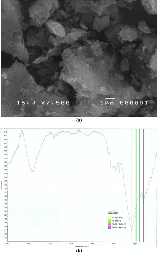 彩运cy888 图1:活性炭负载的磷钨酸(a)x7500放大倍数的扫描电子显微镜图像和(b)FTIR光谱。