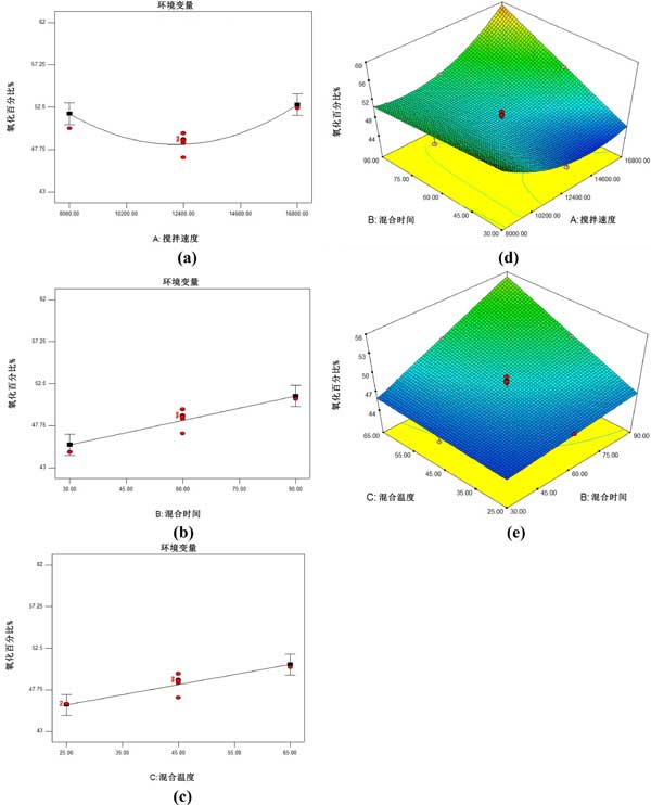 图2:(a)混合速度、(b)混合时间和(c)混合温度与活性炭催化氧化百分比相关的模型图和(d)混合时间和混合速度和(e)相互作用的影响的3D模型图。