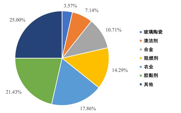 彩运cy888 硼是自然界七大必需微量元素之一,少量的硼摄入有利于植物细胞膜保持其结构和功能的完整性,并维持正常的发育和物质运输。硼不仅是生物体必需的微量元素,也是许多工业的重要原料,如制造业和农业。根据近期的统计数据,仅硼酸盐就有300多种应用,全球四分之三以上的硼消耗量来自陶瓷、洗涤剂、化肥和玻璃(图2)。在生产过程中,硼酸盐是制造各种特殊玻璃和陶瓷的主要成分。在高级玻璃和玻璃纤维的生产中使用硼硅酸盐可以提高玻璃的耐热性和透明度,有利于提高其化学稳定性以及抗机械和热冲击的能力。在瓷釉中加入硼可以防止脱釉和开裂,提高产品的光泽度和耐久性。在瓷体中加入硼酸盐有利于降低能耗,提高产品的机械强度。硼还用于生产微合金锻钢并提高钢的冲击强度。在农业领域,硼被用于生产含硼化肥等产品。但是灌溉水中的硼含量升高会直接导致动植物中毒造成危害,所以一定要控制排放。