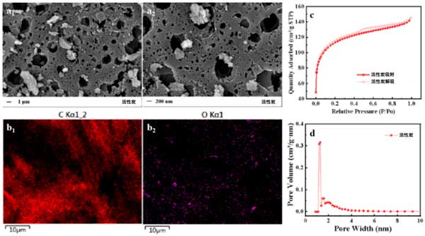 彩运cy888 图1:活性炭的SEM(a1,a2)、EDS(b1,b2)、N2吸附-脱附等温线(c)和孔径分布(d)图像。