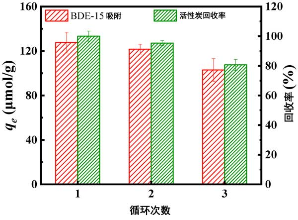 为研究活性炭处理洗脱液后的循环利用性能,采用甲醇洗脱活性炭进行再生回用。如图3所示,在三个回收-吸附循环中,活性炭的吸附量略有下降,活性炭的吸附量保持在103μmol/g以上,下降了25μmol/g(下降了19%)。活性炭表现出良好的可回收性和可重复使用性,有利于实际应用。