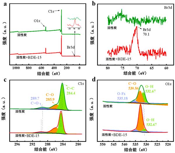 图4:吸附前后活性炭的XPS全光谱(a)、Br3d光谱(b)、C1s光谱(c)和O1s光谱(d)。