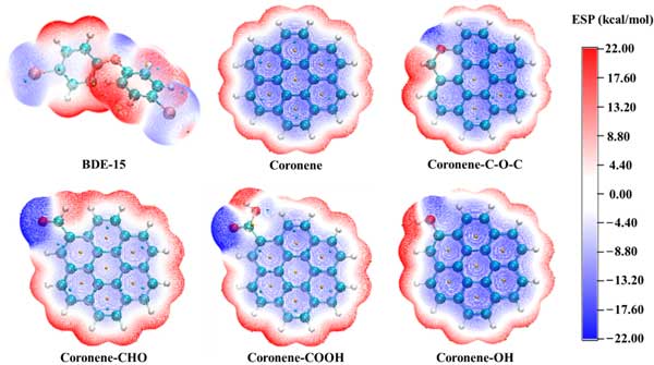 为进一步研究PBDEs与活性炭之间的微观相互作用机制,通过计算化学研究了活性炭结构模型与BDE-15之间的弱相互作用。根据表征结果,构建了以晕苯为基本结构的纯碳结构模型,以及羧基、羟基、醛和醚取代的结构模型,模拟了活性炭的不饱和碳结构和含氧官能团结构。BDE-15和五种活性炭结构模型的静电势如图5所示。BDE-15在其溴原子和氧原子附近显示出负静电势,而在其他区域,尤其是在其氢原子附近,则显示出正静电势。这是因为溴原子和氧原子的电负性大于碳原子,而氢原子的电负性最小。在Coronene的结构中,所有的碳原子都表现出负的静电势特征,而氢原子则表现出正的静电势特征。含氧官能团的引入增加了基团附近的正静电势面积和负静电势面积,属于结构中极性最强的区域。根据正负静电势相互吸引的原理,BDE-15和活性炭结构模型可以形成多种复合构型。可以推测,基团附近存在强静电势区使得BDE-15更容易与基团结合。