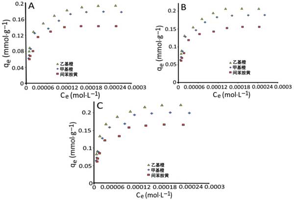 图2:25℃(A)、35℃(B)和45℃(C)下偶氮染料在活性炭上的吸附等温线。