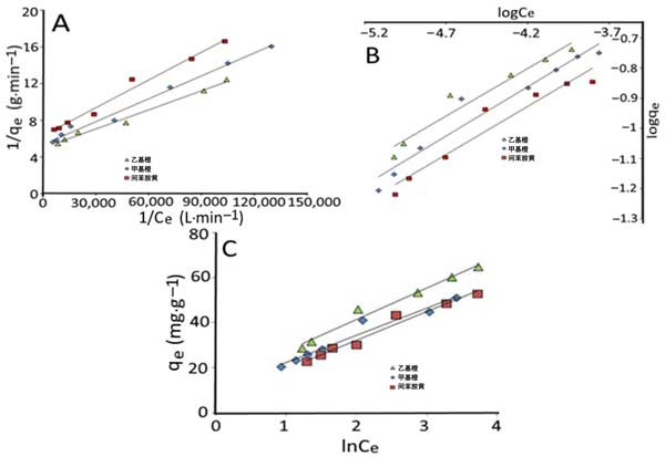 图3:Langmuir(A)、Freundlich(B)和Temkin(C)在25℃下偶氮染料在活性炭上上的吸附等温线。