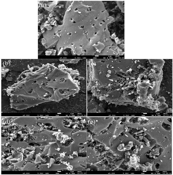 彩运cy888 图1:(a)未改性活性炭、(b)改性活性炭1、(c)2、(d)3和(e)4的SEM图像。