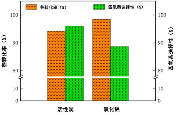 图3:活性炭和氧化铝催化剂的萘转化率和四氢化萘选择性。