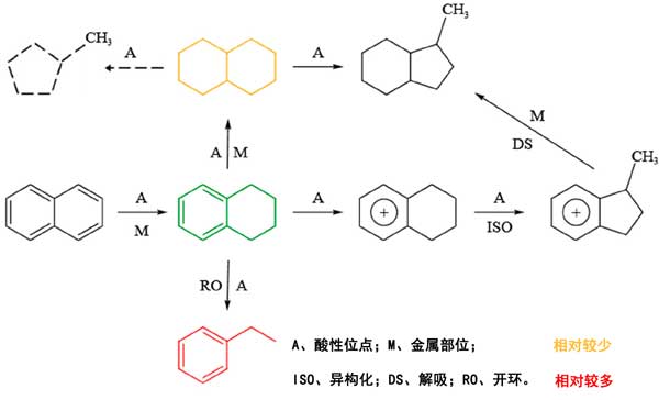 萘在改性活性炭催化剂上的加氢路径如图4所示。与氧化铝催化剂上的类似,活性炭催化剂上的萘在酸性位点和MoS2的共同作用下可以生成四氢化萘和十氢化萘。四氢化萘在酸性位点与烷基苯形成碳鎓离子,然后异构化为甲基-茚碳正离子,最后在活性位点解吸成1-甲基-茚满。同时,四氢化萘在酸性位点受到溢氢作用时,苯环的α位和γ位断裂,生成乙苯。通过从酸性位点上的MoS2活性位点溢出氢气,萘烷进一步加氢裂化为1-甲基-茚满。与氧化铝催化剂相比,活性炭催化剂产生更多的四氢化萘和更少的萘烷,这是因为活性炭催化剂比氧化铝具有更少的酸位。