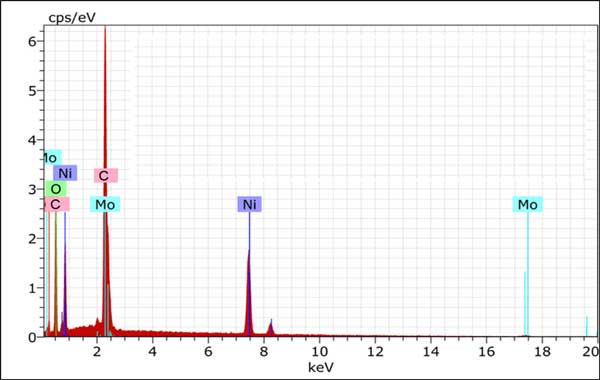 图1:6%NiMo活性炭催化剂的EDX光谱,分析证实存在约82%的活性炭、5.7%的镍和14.5%的钼。
