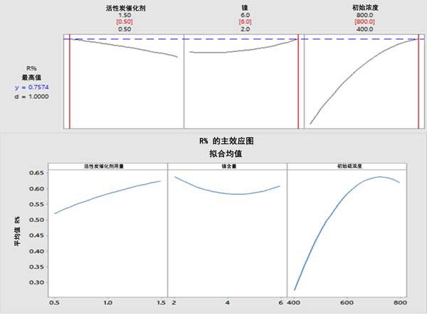彩运cy888 图2:研究变量对二苯并噻吩转化率的影响,转化率随着活性炭催化剂用量和初始硫浓度的增加而增加,随着Ni负载量的增加而降低(上图)。对于活性炭催化剂用量、Ni负载量和初始硫浓度,在0.5g、6%和700ppm时,最佳二苯并噻吩转化率分别为75.74%(下图)。