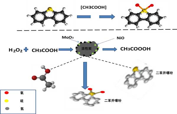 为了更好地理解H2O2/CH3COOH体系在NiO-MoO3活性炭催化剂存在下的氧化脱硫机理,假设存在NiO作为助催化剂,而MoO3作为活性相,反应由MoO3引发,涉及过氧化氢的水解裂解产生强氧化剂(活性羟基自由基(OH•),这些活性自由基攻击乙酸产生过乙酸,为二苯并噻吩提供氧气生产二苯并(含有S=O)并进一步攻击产生二苯并噻吩(含有O=S=O)。