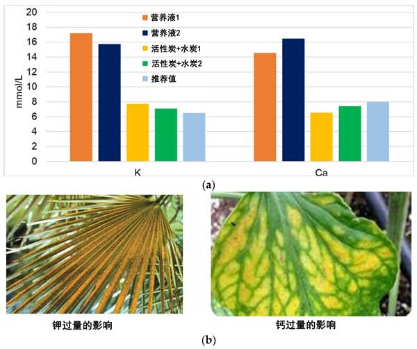 图2:(a)通过活性炭和水炭处理将较高浓度的Ca和K降低到安全的可回收水平。(b)过量的钾和钙对植物生长的影响。