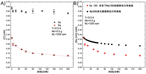 彩运cy888 比较了Se(VI)+Re(VII)体系和单独Re(VII)体系的吸附动力学曲线和吸附容量。得到的结果如图1A和B所示,清楚地显示了动力学曲线和吸附容量的差异。如图1B所示,Re(VII)和Se(VI)的混合物对Re(VI)的吸附远高于Se(VI),表明对Re(VII)的选择性。处理240分钟后,铼离子浓度从0.3mM下降到0.11mM,这意味着>60%的铼离子被吸附。然而,在硒吸附的情况下,如图1所示A,Se(VI)的初始浓度(0.63mM)和最终浓度(0.59mM)之间的差异等于0.06%(图1A)。该值在测量误差范围内,可以忽略不计。在这个过程中已经证实了活性炭对Re(VII)的选择性。根据获得的结果,确定将仅针对Re离子进行进一步的研究工作。