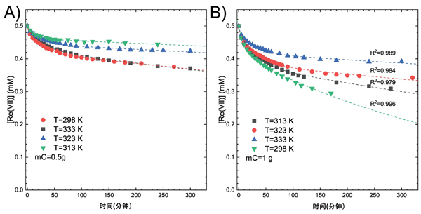 彩运cy888 图2显示了溶液Re(VII)的初始浓度=0.5mM在不同温度和活性炭量下的动力学曲线。图2A和B显示了当每200cm3溶液分别使用0.5和1g活性炭时的浓度变化。溶液中使用的活性炭量越大,Re(VII)浓度的降低越显着。这种趋势归因于吸附剂的大比表面积,这导致了大容量。碳含量加倍使表面积加倍。