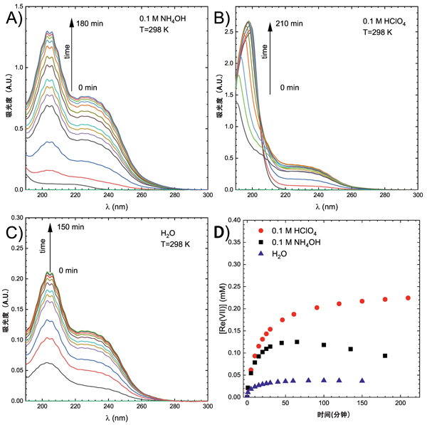 彩运cy888 对于解吸研究,在25℃吸附后,200cm3溶液使用1g活性炭。Re(VII)离子的初始浓度为0.5mM。吸附后,将样品分成三部分。然后在三种环境中进行解吸,即0.1M/HClO4、0.1M/NH4OH和H2O。在所有情况下,每50cm3液体使用0.3g活性炭。UV-Vis光谱和动力学曲线如图4。