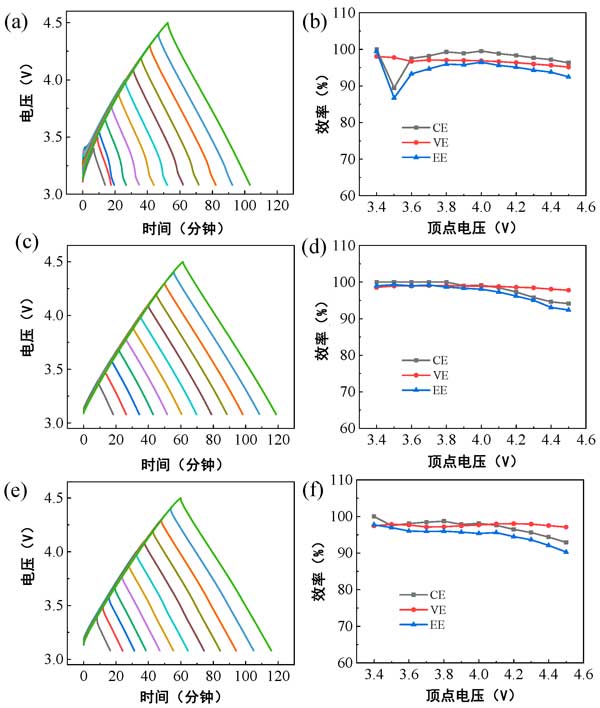 图1:活性炭锂半电池在不同锂离子电解质中从pzc到各种顶点电压的恒电流充放电曲线:(a)EDD,(c)EPD,和(e)PCE;相应的EE、CE和VE值作为顶点电压的函数:(b)EDD,(d)EPD,和(f)PCE。
