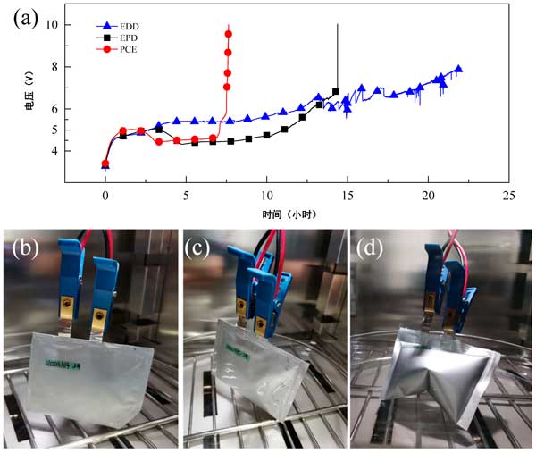 图2:过充至10.0V的活性炭锂半电池:(a)电压随时间变化曲线,以及使用不同电解质过充过程后半电池的照片:(b)EPD,(c)PCE和(d)EDD。