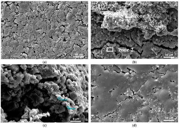 图3:(a)交流电极和来自活性炭锂半电池的交流电极的SEM图像充电到10.0V的高电压,具有不同的电解质(b、c)PCE,(d)EPD。