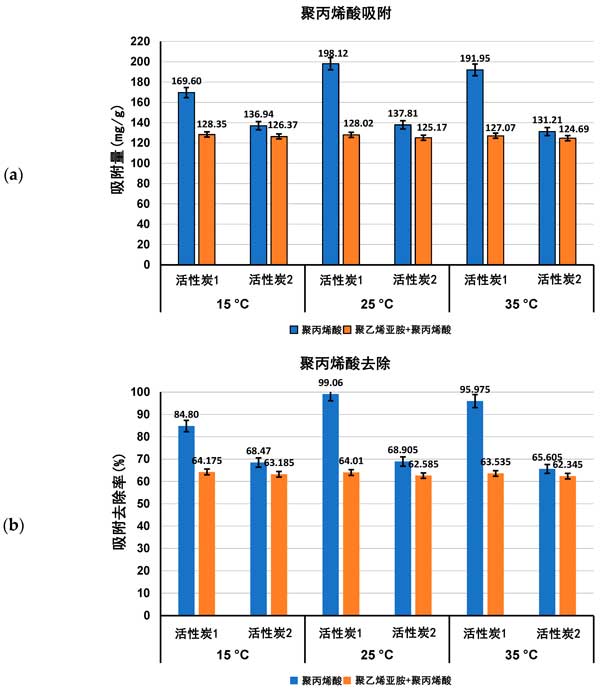 彩运cy888 图1:聚丙烯酸吸附量(a)及其从活性炭表面去除的百分比(b)在单一和混合吸附物系统中,在三个检测温度pH值3下。